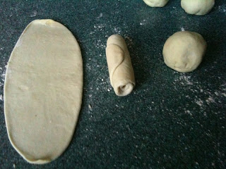 7. Kemudian,canai memanjang doh bulat tadi dengan hati2 (pastikan roller disalut dengan tepung).Hati2 semasa mencanai kerana doh A sangat rapuh.